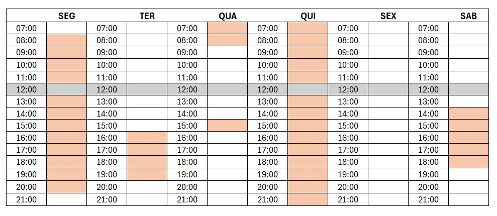 Os horários em branco estão livres.