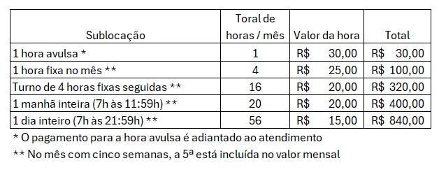 Valores e agenda do Coworking Clínico